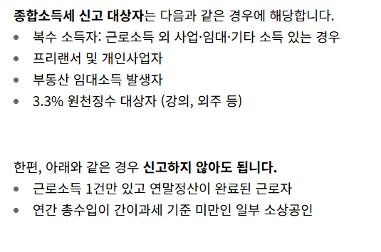 신고 대상은 다음과 같습니다. 근로소득만 있는 자로서 연말정산을 한 경우는 신고를 하지 않아도 됩니다. 그러나 두 개 이상의 직장에서 근로소득을 얻거나, 퇴직 후 소득이 있는 경우, 또는 사업소득이 있는 경우에는 반드시 신고해야 합니다. 또한, 연간 소득이 7,500만 원 이상인 경우에도 신고 의무가 있습니다.
