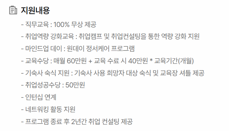 직무 교육 참여 시에는 교육 수당(월 최대 100만 원 등)을 지급하며, 기술 자격 취득 기회도 제공하여 취업 경쟁력을 높일 수 있도록 돕습니다.